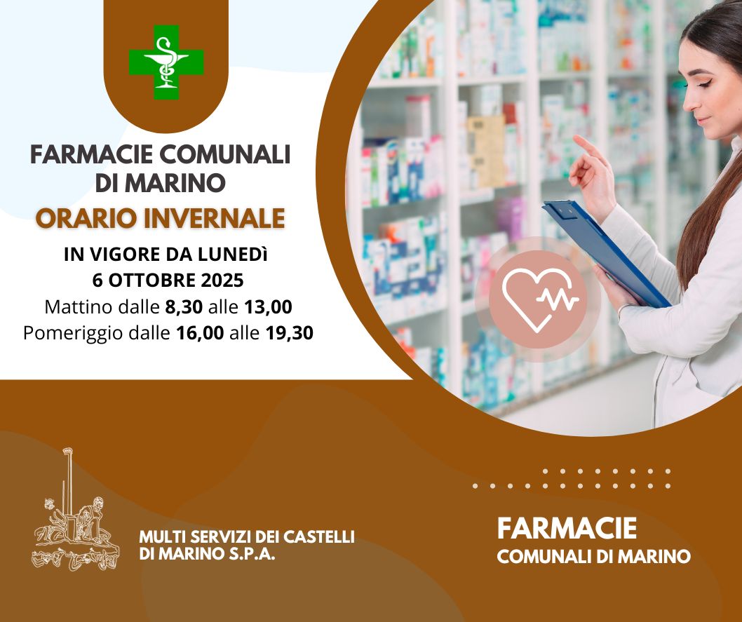 FARMACIE COMUNALI DI MARINO: IN VIGORE DA LUNEDì 6 OTTOBRE L’ORARIO INVERNALE